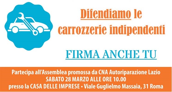 - partecipare all’Assemblea di CNA Autoriparazione Lazio di sabato 28 marzo ponendo direttamente la tua firma sulla petizione cartacea che abbiamo predisposto o eventualmente inviarle via fax al num. 06 57015222.