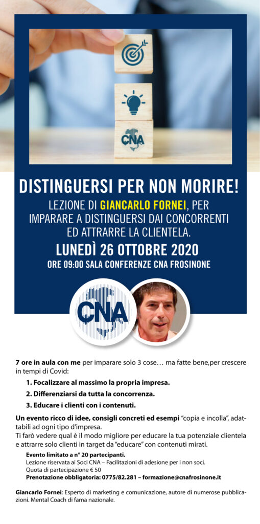 Distinguersi per non morire – Imparare a distinguersi dalla concorrenza ed attrarre clienti Scenaryo 5 Ottobre 2020Cna Nazionale Incontro con l’esperto Giancarlo Fornei Condividi