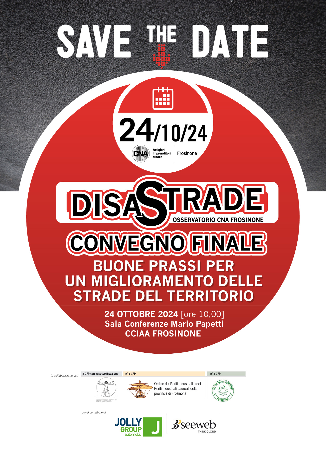 Giovedì 24 ottobre alle ore 10:00, presso la Camera di Commercio di Frosinone, si terrà il Convegno finale del Progetto Disastrade. Il tema centrale sarà il miglioramento delle strade del territorio, con la presentazione del Manifesto CNA realizzato in collaborazione con UNICAS e gli Ordini Professionali. Il manifesto, suddiviso in otto punti, offrirà linee guida per la gestione e manutenzione...